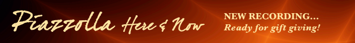 Astor Piazzolla continúa inspirando al mundo con la irresistible pasión de su música. El album Piazzolla Here & Now (Piazzolla Aquí y Ahora) brinda al oyente fascinantes arreglos previamente ausentes del repertorio para violín y piano. Tales arreglos incluyen Las cuatro estaciones porteñas, Oblivion, y Allegro Tangabile. Las canciones Chiquilín de Bachín y Che, Tango, Che! también en nuevas versiones, fueron grabadas en concierto con la actriz Gabriella Cavallero y la contrabajista Laura Ruas. Narradas por Cavallero, el album incluye dos citas de la obra de teatro The Magic Fire (El fuego mágico) de Lillian Garret-Groag. Nacida en la Argentina, la escritora describe con exquisita sensibilidad la esencia del tango, reflejada en la vida del inmigrante y su eterna nostalgia por la tierra lejana y por lo que ya no volverá.